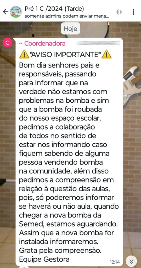 Crianças estão sem aula na creche Valdete de Lima Pinto em decorrência de um ato lamentável. De acordo com informações divulgadas em um grupo de WhatsApp, a coordenação do Centro Municipal de Referência em Ensino Infantil localizado no PAAR informou que a bomba d’água do espaço foi roubada. Sem água, não tem condições dos alunos ficarem no local.